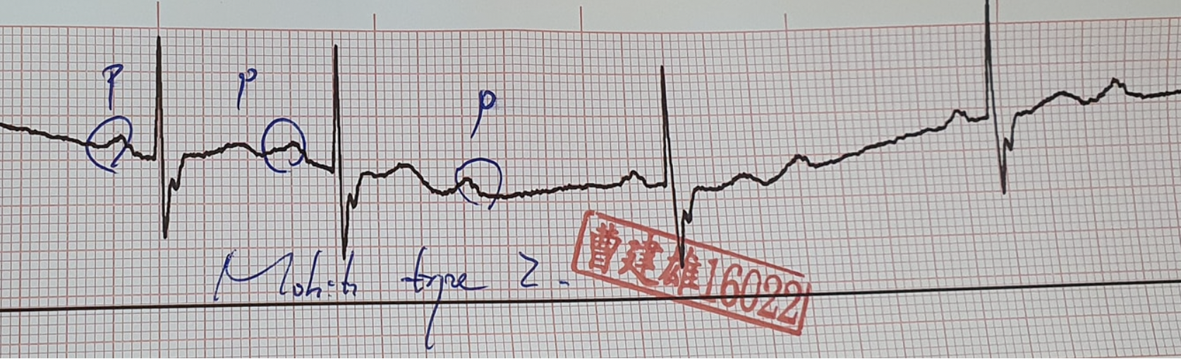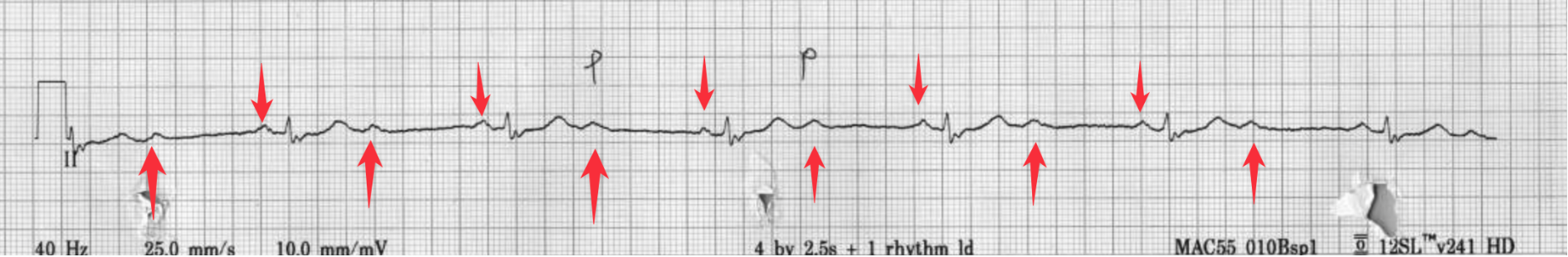 Rhythm: SR,但是出現多個P wave➔可以見到T wave後面又多一個P wave,這個P後面沒有立馬接個QRS,代表atrium放電往下傳,傳不到ventricle就斷電了