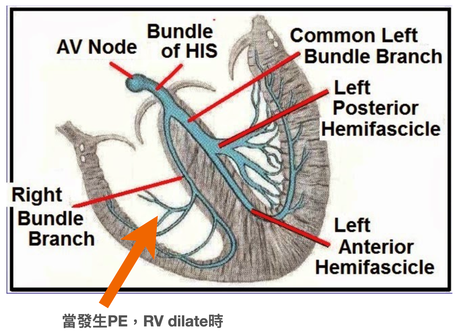 Pul.trunk塞住,導致RV dilate,RV dilate時就會拉扯spetum裡面的RBB,導致缺血,而形成RBBB