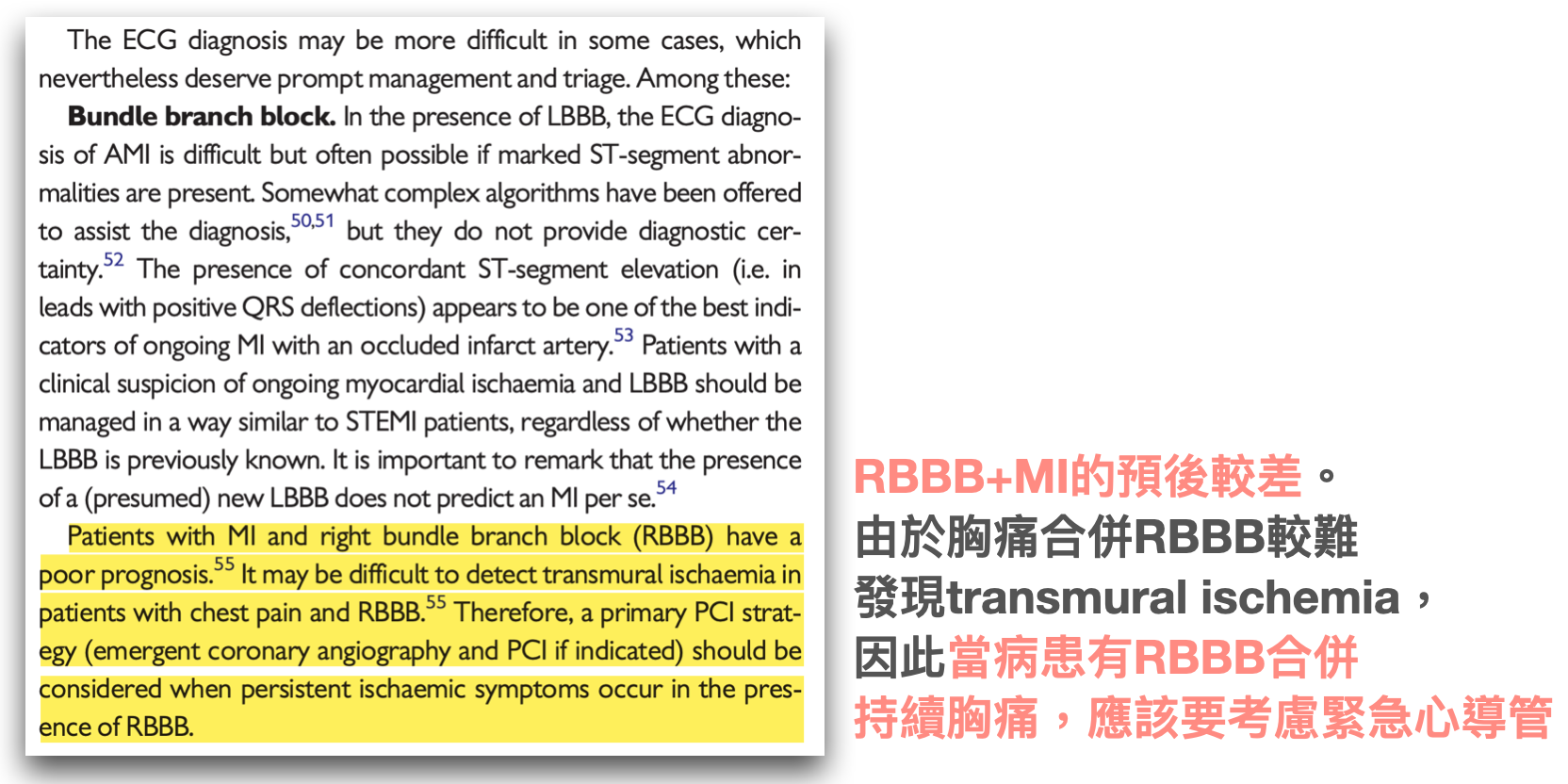 此外在2017 ESC STEMI Guideline針對病患出現RBBB,有以下建議 7 :