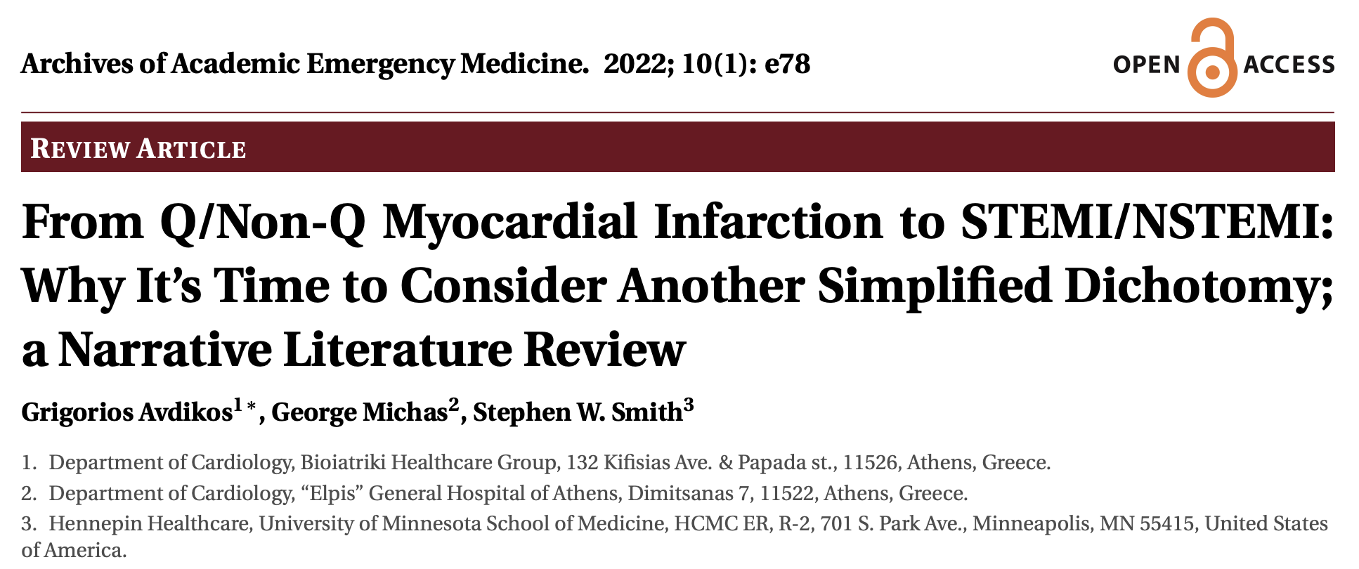 Avdikos, G., Michas, G., & Smith, S. W. (n.d.). From Q/Non-Q Myocardial Infarction to STEMI/NSTEMI: Why It’s Time to Consider Another Simplified Dichotomy; a Narrative Literature Review. ↩︎