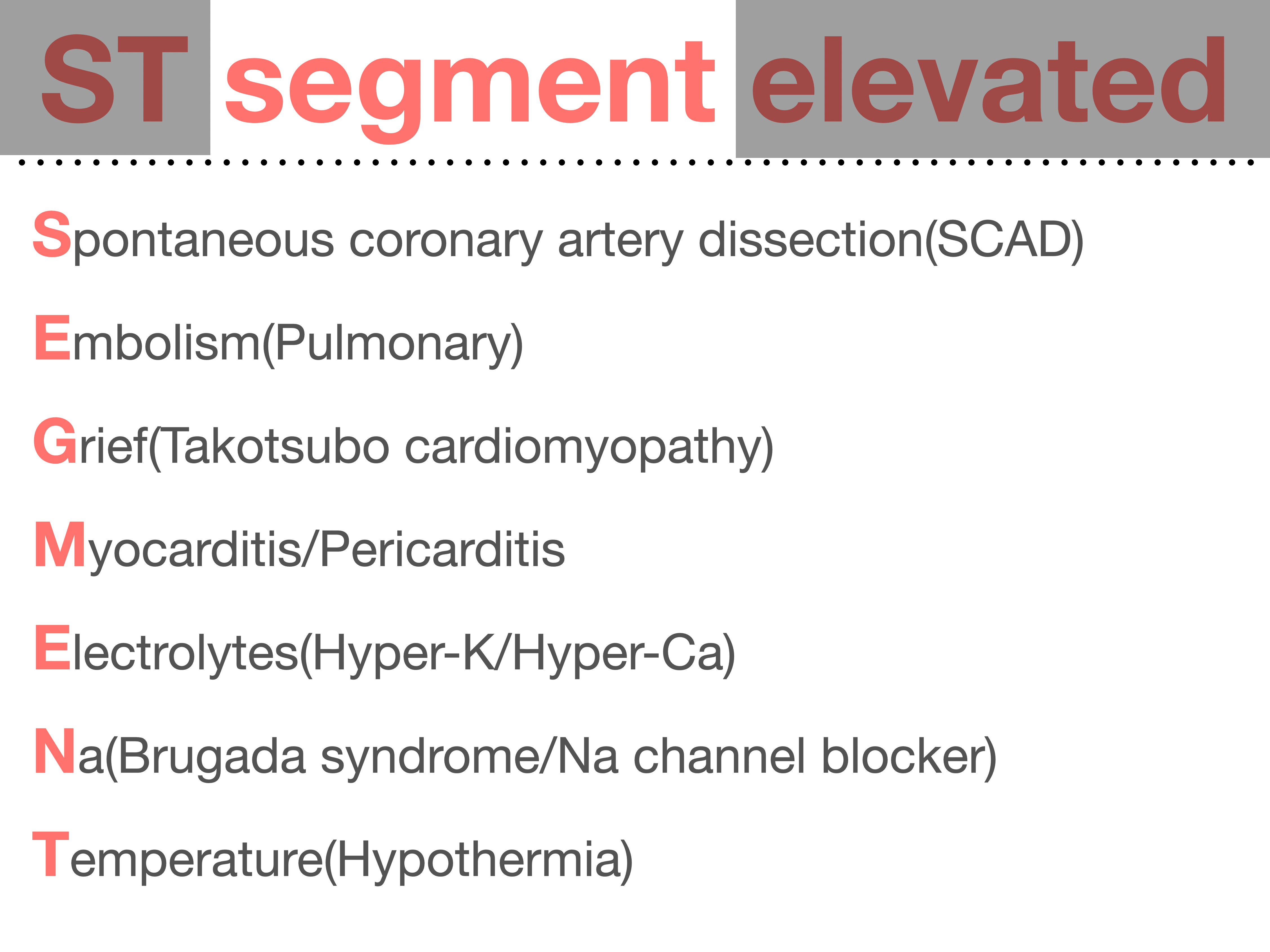 我自己記憶STEMI mimics的口訣是用ST segment elevated,每個字母都是一種狀況,都有可能造成STEMI mimics的情形(第2張最後的t,指的就是低體溫)